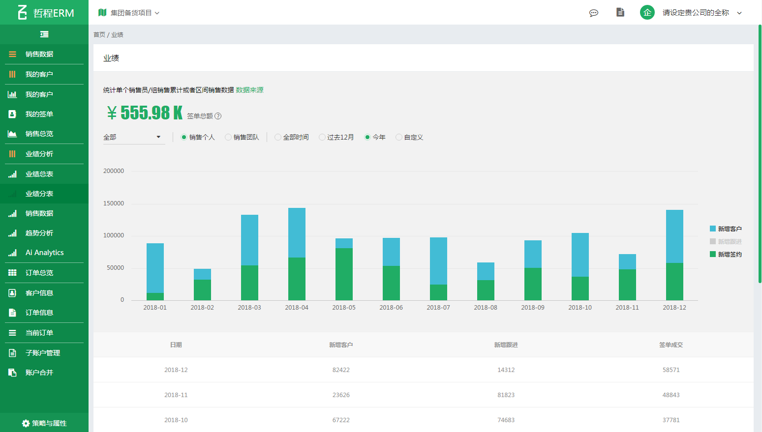 查询销售业绩数据、跟单数据、签单等所有客户数据,并可通过业绩分析和预测模块做Ai大数据统计分析